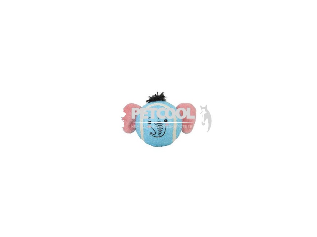 Tenisový pískací míček v podobě sloní hlavy s ušima.